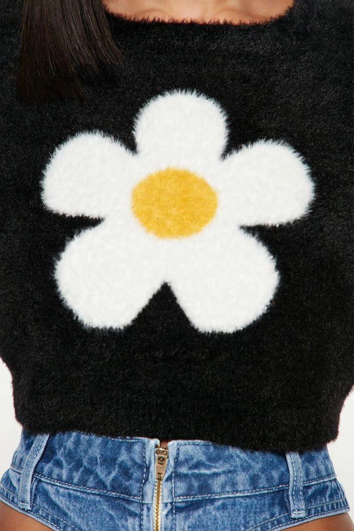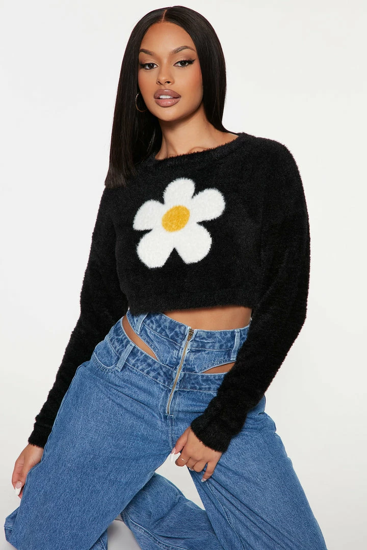 Best deal ❤️ Fashion Nova Sugar And Spice Fuzzy Flower Sweater – Black/combo Pullovers ⭐